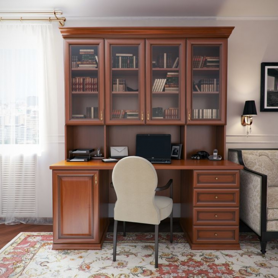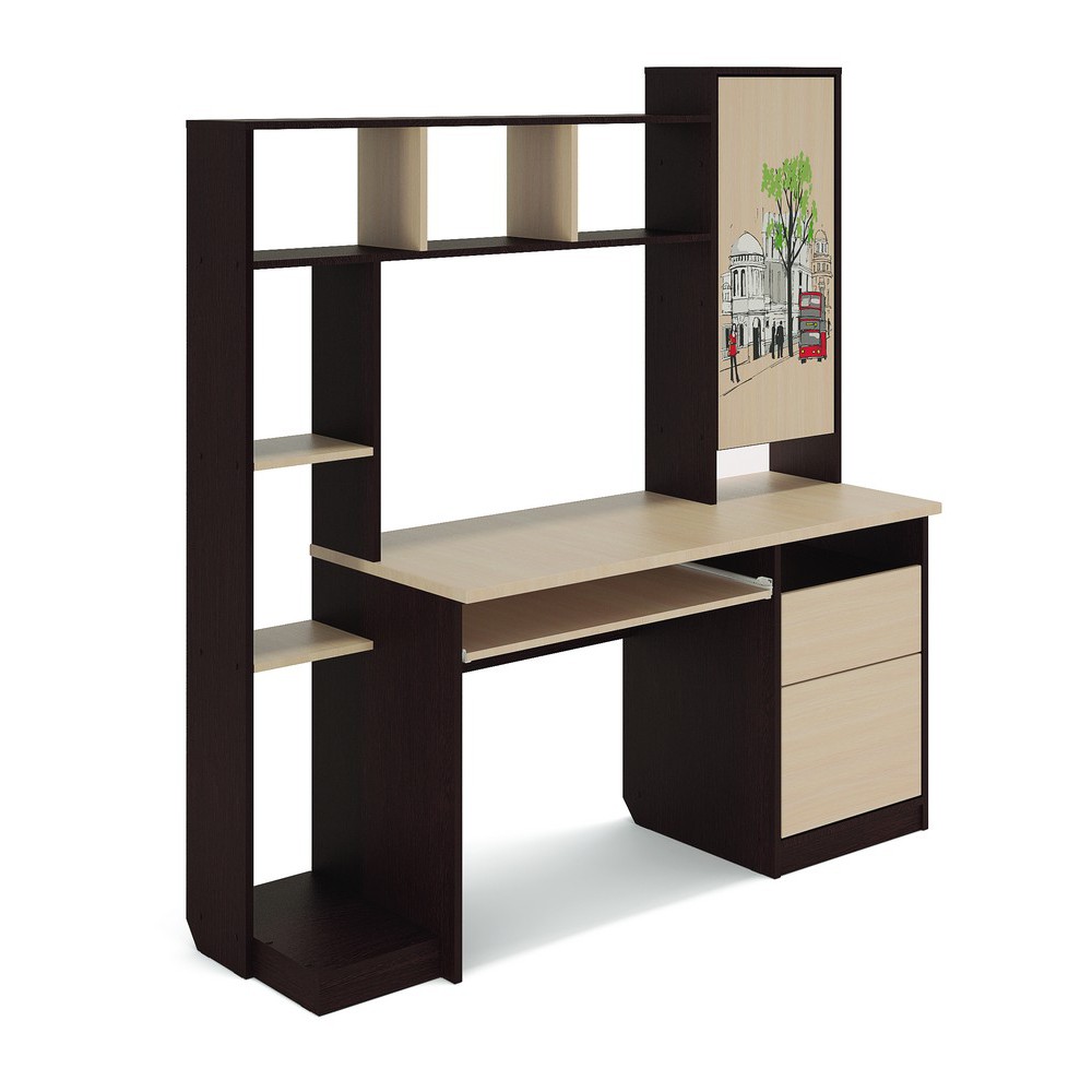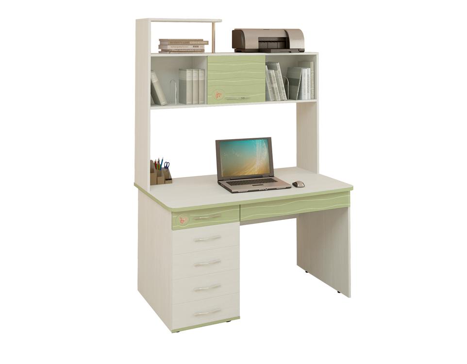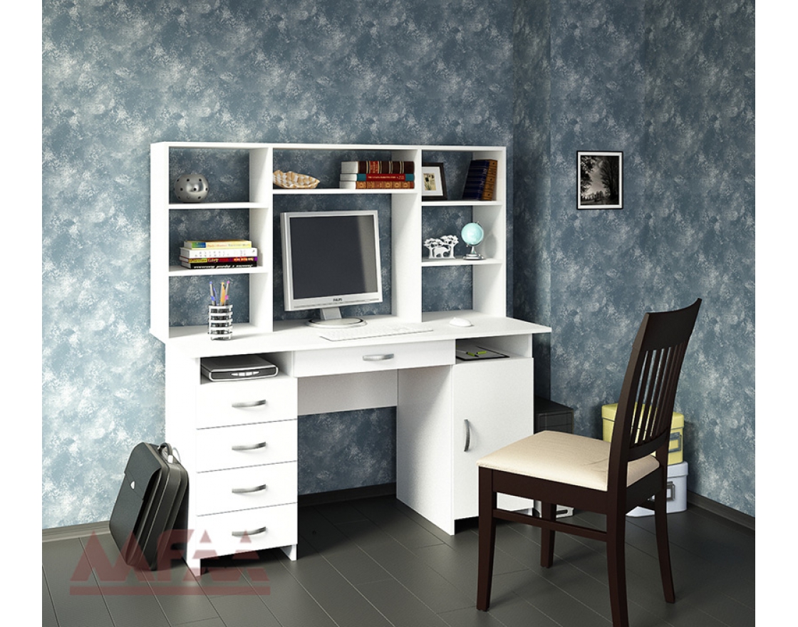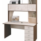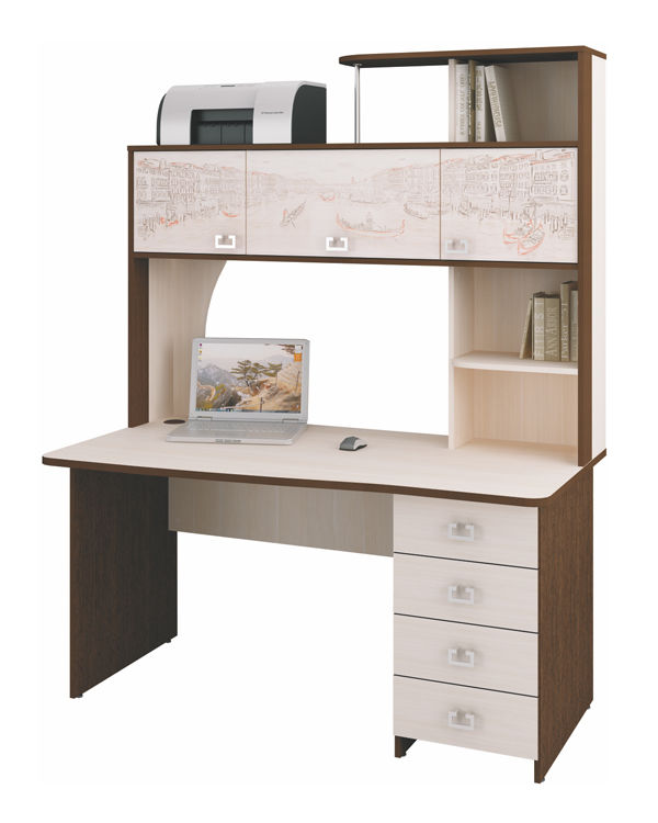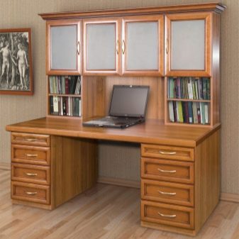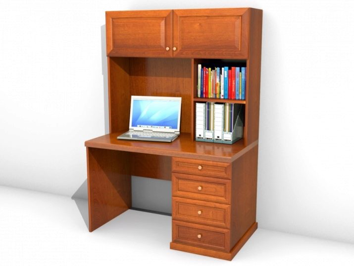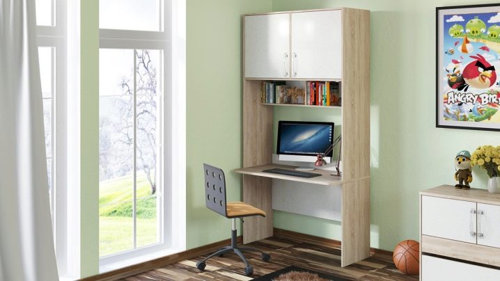 A table with cabinets located above the table top is also well suited to equip a children's room of any size. This design will be an excellent replacement for a variety of cabinets and cabinets. It is convenient to work at such a table, without thinking about where to put all the details necessary for studying.