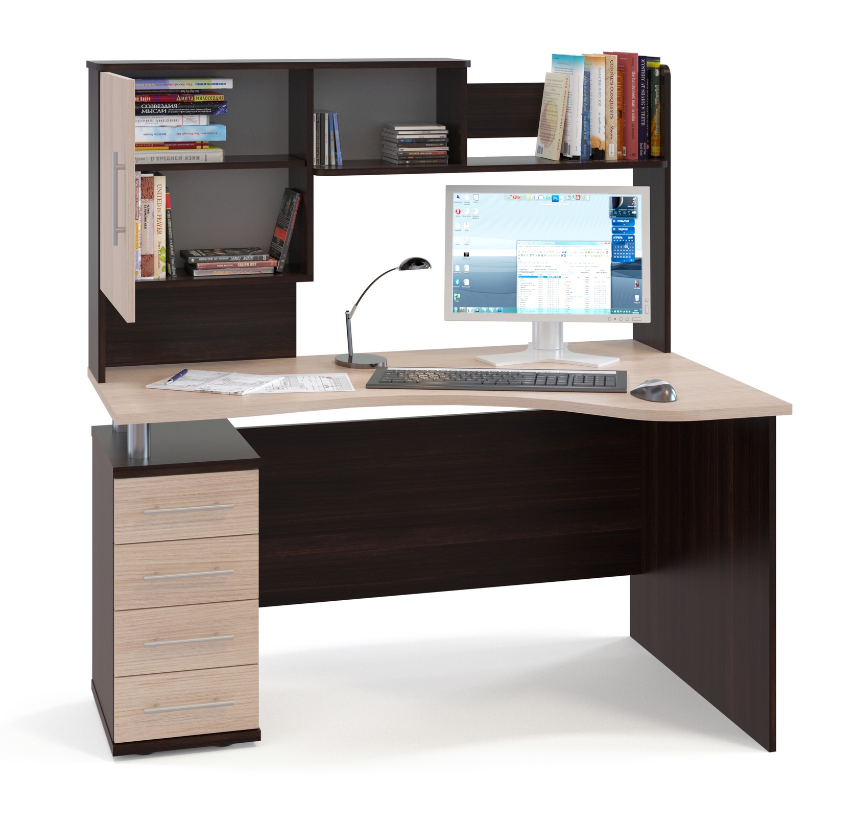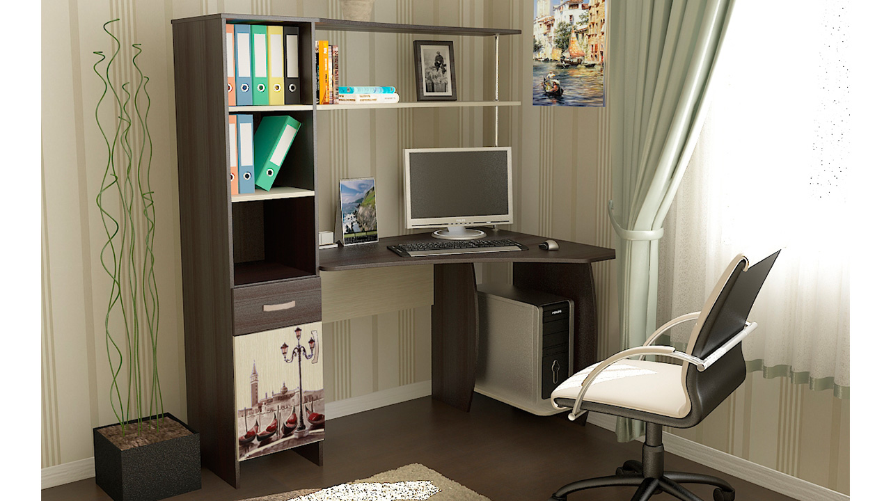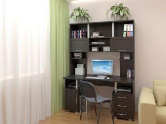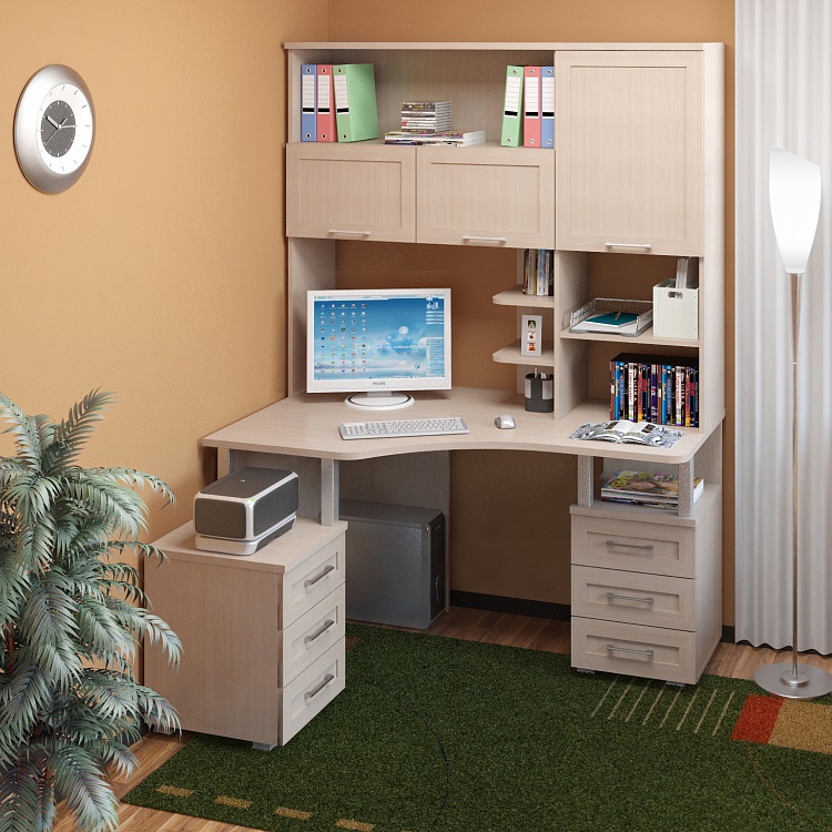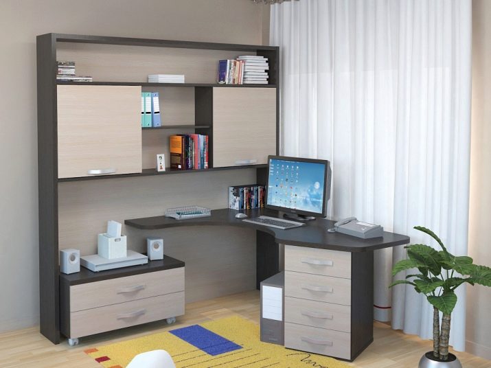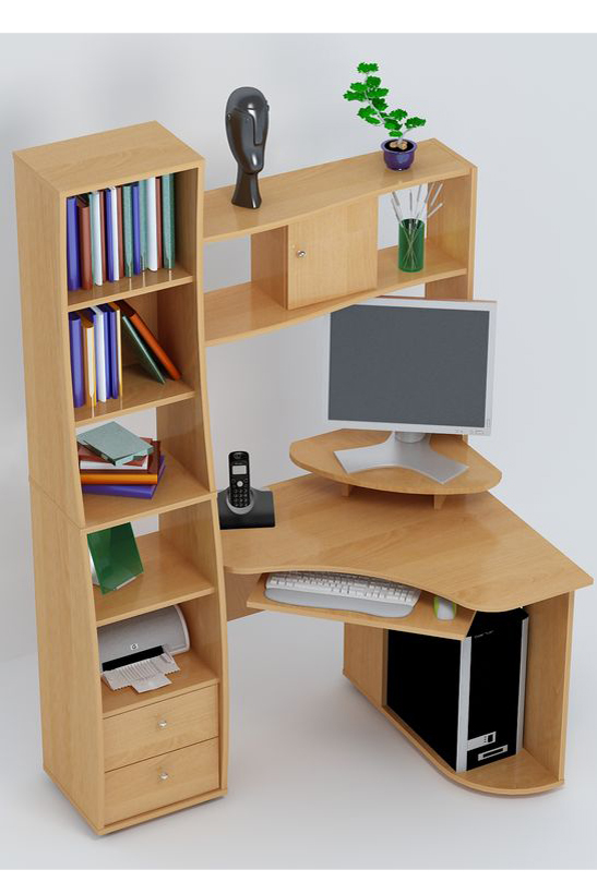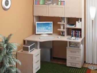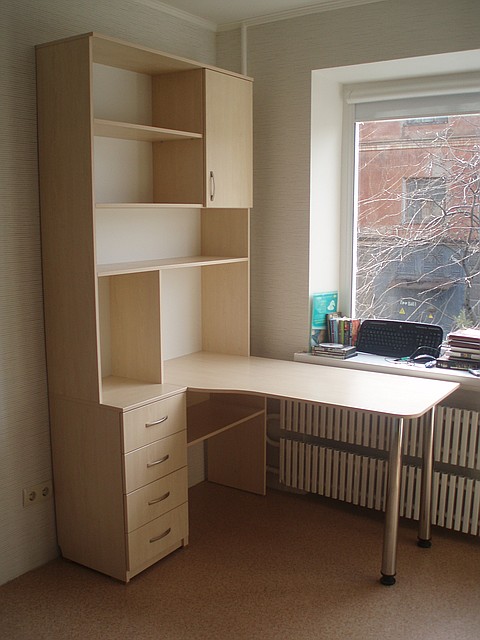 The corner desk is located in the least used place - in the corner of the room. At the same time, it takes not so much space, well accommodating all the important details: books, textbooks, exercise books and office.