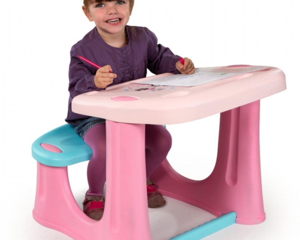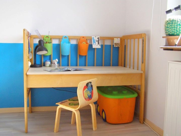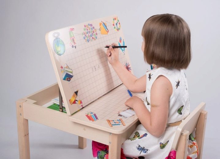 The transforming table can have several sliding surfaces and drawers for storing office, notebooks or colorings.Accessories in the form of replaceable rolls of paper for drawing and containers-cases with crayons or bills will be a big plus. It is important that the child has mastered all the structures and can be controlled with them.