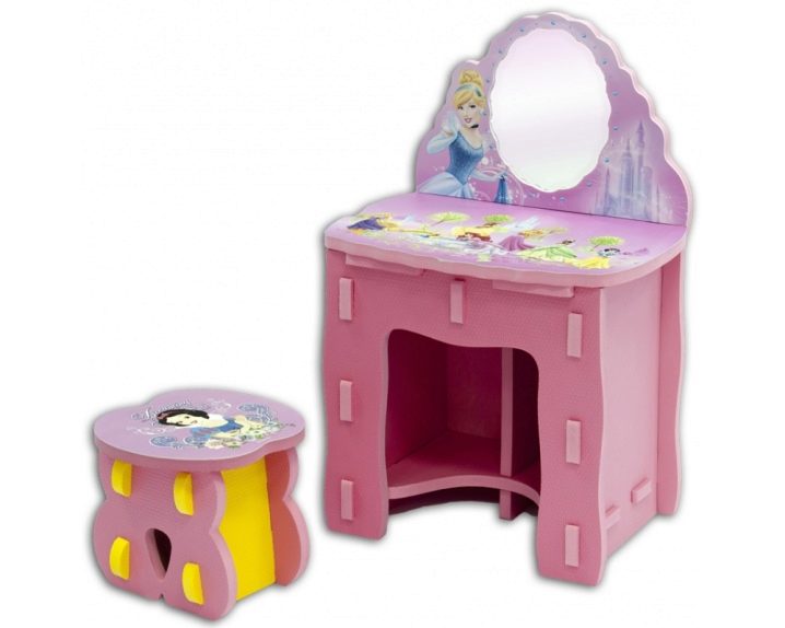 In the room for the girl a dressing table will look good. Under the table you can place small drawers or shelves for combing and decorating.Instead of a chair, you can pick up a ottoman or a stool with a soft seat. This kit will love the little fashionistas.