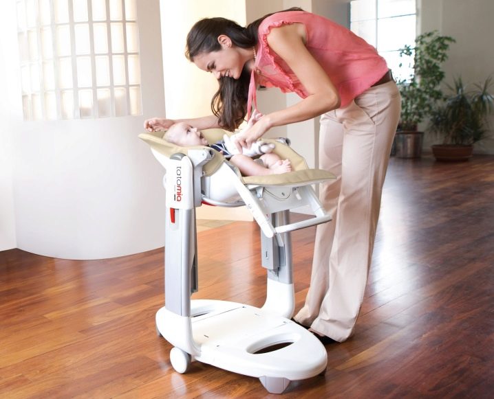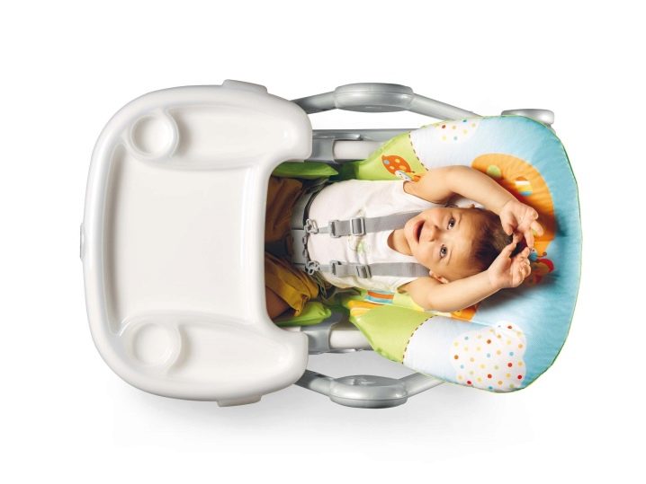 The stool will be even more convenient if it is equipped with such a table, which, if needed, can always be removed, and if there are straps with a five-fold attachment for fixing the baby. You should choose a color model so that it blends harmoniously into the interior of the whole room.