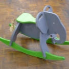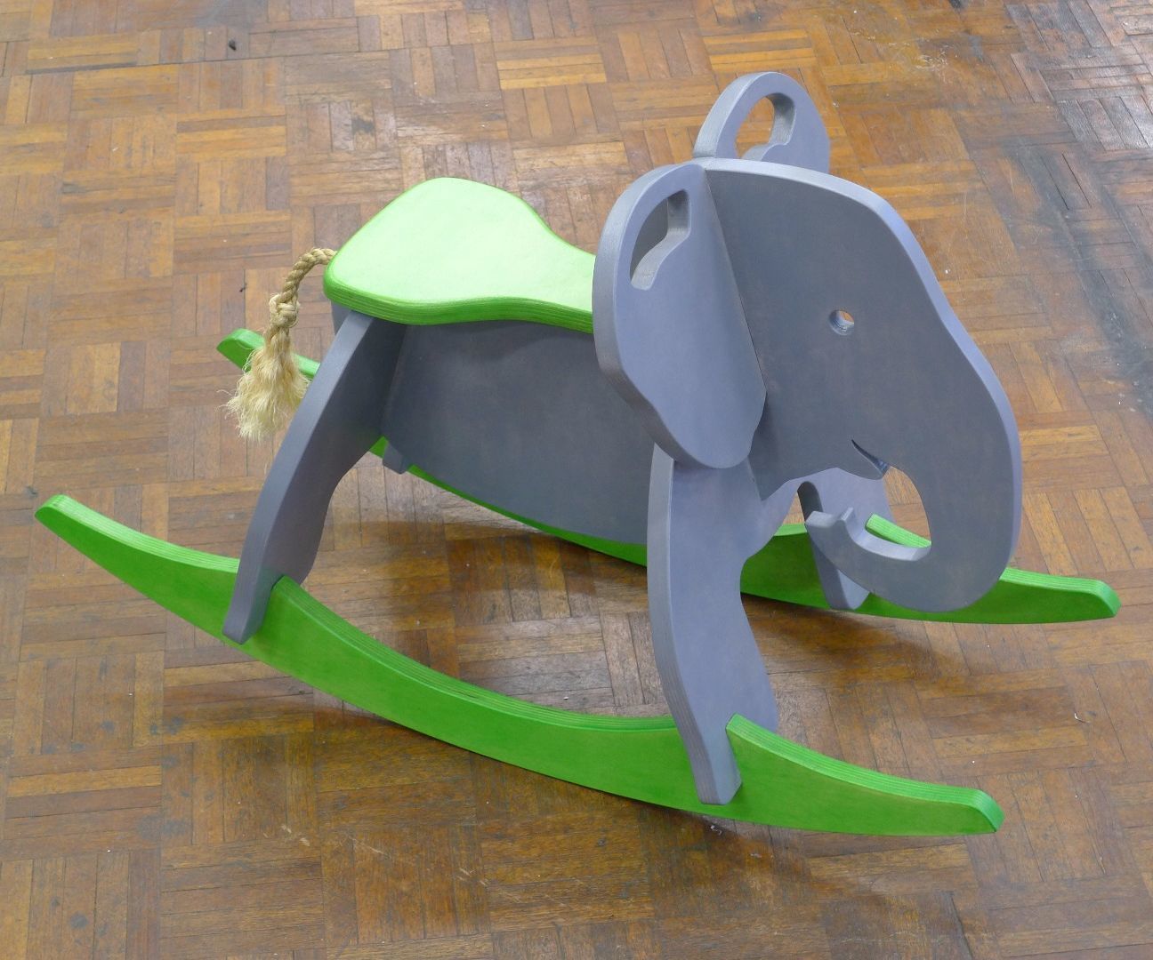 The eyes and tail hole are made with a drill. If you plan to make a non-demountable further construction, then all the joints during assembly are processed additionally with glue intended for gluing wooden products. Attach the base assembly to the finished elephant. Make sure that the gurney swings easily and at the same time is stable.
