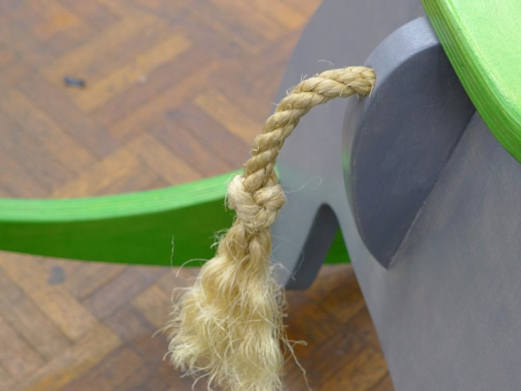 When the children's rocking chair is ready, it remains to fix the rope to the place of attachment of the tail. For the manufacture of the tail, you will need a rope of such thickness that you can freely insert and glue into a previously drilled hole.