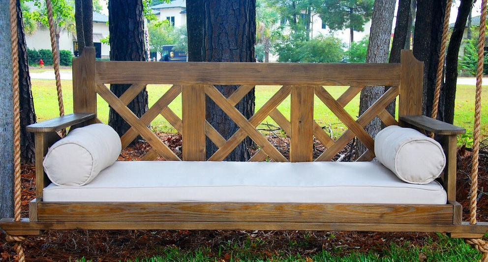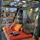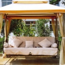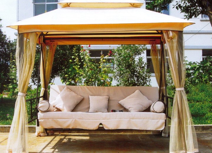 - A support in the form of a gazebo is also quite a popular and uncomplicated option. To do this you will need four pillars,which need to be installed vertically. A frame is installed on top, a crossbar is fastened to it, on which a sofa is hung with a rope and rings. This option is the most beautiful and comfortable, since the furniture also acquires the function of a gazebo.