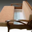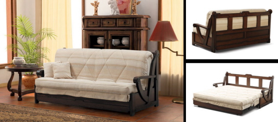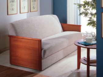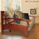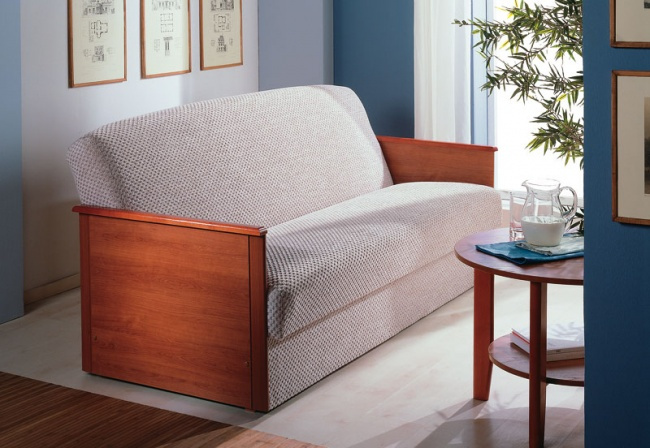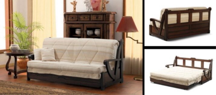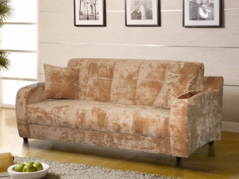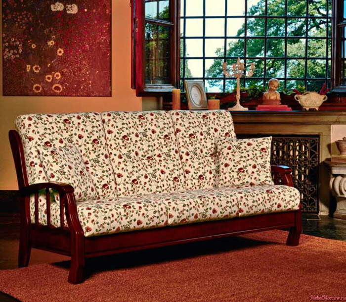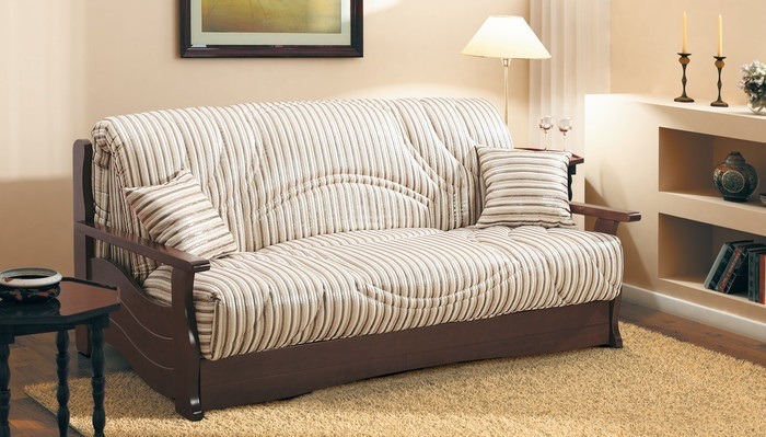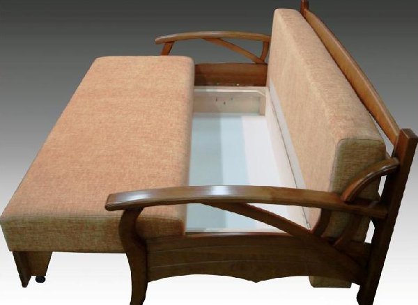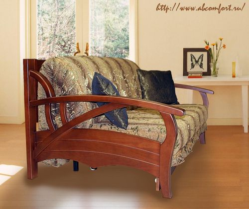 To the sliding sofas are now popular "Accordion". This sofa with a wooden frame and carved armrests is named after the transformation mechanism. It works like this - you need to pull the seat and lower the back in its place.The mechanism is extremely simple - this is a plus, but the place to save with the "Accordion" will not work, since it does not have specialized drawers for linen. Also when unfolding it is installed on steel legs and this can be a little problem if you are used to walking barefoot on the floor.