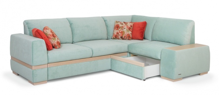 - Large modular sofa "Mista" it is distinguished by the use of an innovative filler “Sorel” in the back cushions, repeating the shape of a seated person who feels “immersed” in a sofa. This creates additional comfort. Decorative inserts and legs are made of wood in the color of wenge or walnut. You can also order a wooden lining on the armrests. A large bed is formed almost without occupying additional room space. This allows you to make the mechanism "dolphin".The model is equipped with a roll-out storage space.