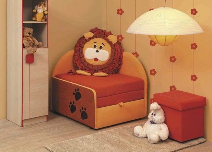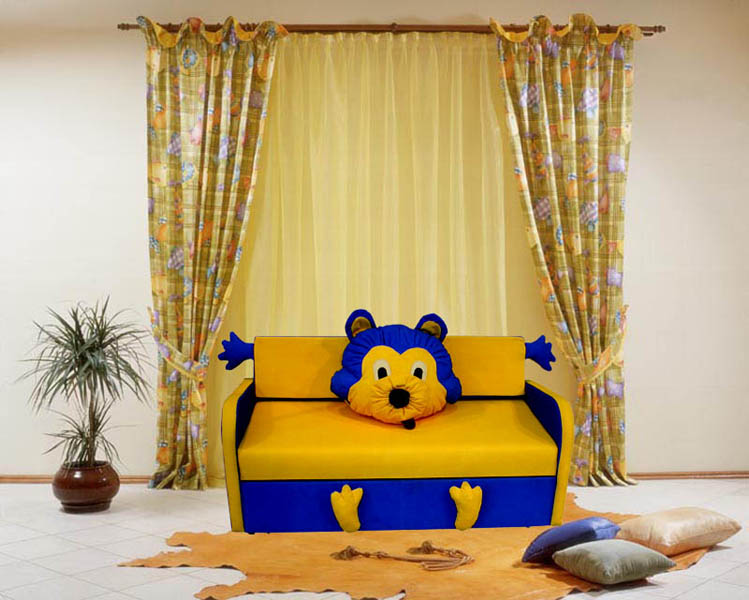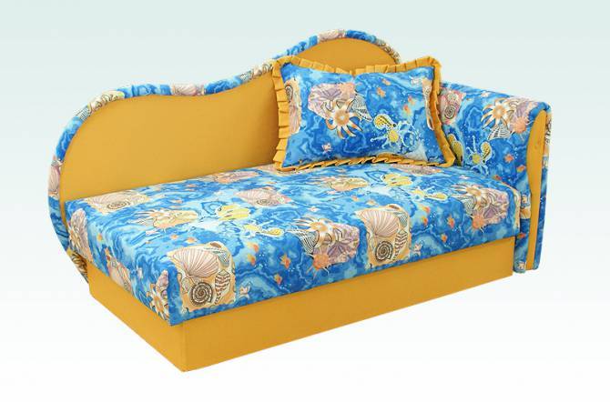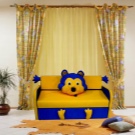 Mini-option for a children's bedroom is a sofa canapé model "A lion". When assembled, it looks more like a big chair. The upper pillow is removed, the body rolls out - and a full-fledged sleeping place with a left or right angle is already obtained as a kitchen garden. Such an amusing children's model of upholstered furniture with a cute lion cub costs about 10 thousand rubles.