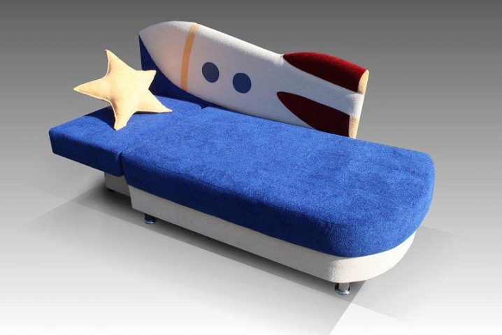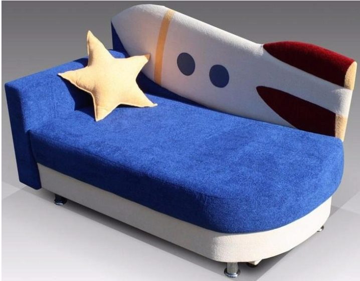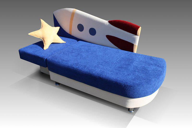 Folding mechanism in the sofa "Rocket" reliable and easy to use. Inside there is a box for bed linen. Included is a stylized yellow star-shaped pillow. When assembled, such a model of the sofa will require quite a bit of space, in the unfolded it is already a full bed. The back is made in the form of a real space rocket.
