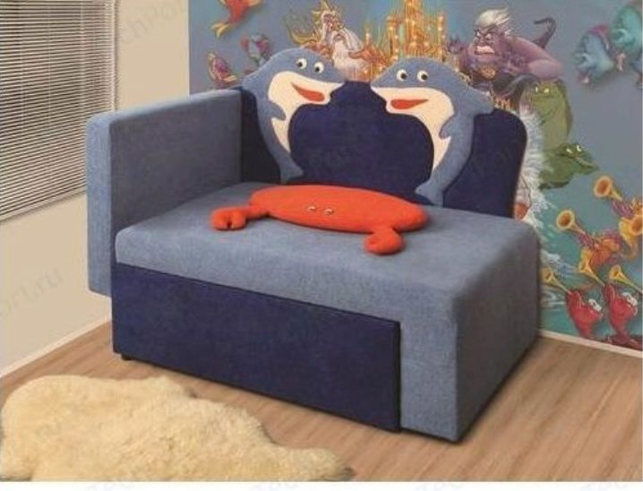 Sofa "Dolphin" created for the smallest inhabitants of the house. Its dimensions are: height - 84 centimeters, width - 132 centimeters, depth - 101 centimeters.The cost of this model is quite budget and amounts to about 9 thousand rubles. On the back are two funny friendly dolphins. The set also has a pillow, made in the form of a crab.