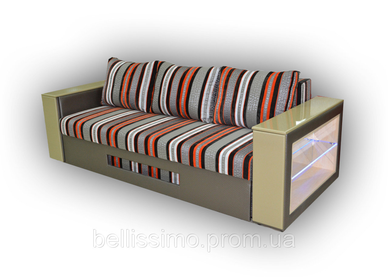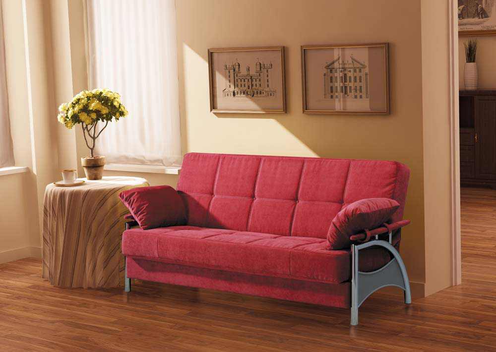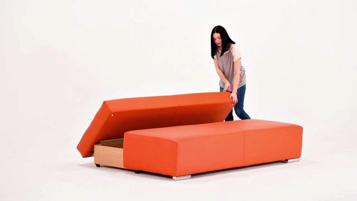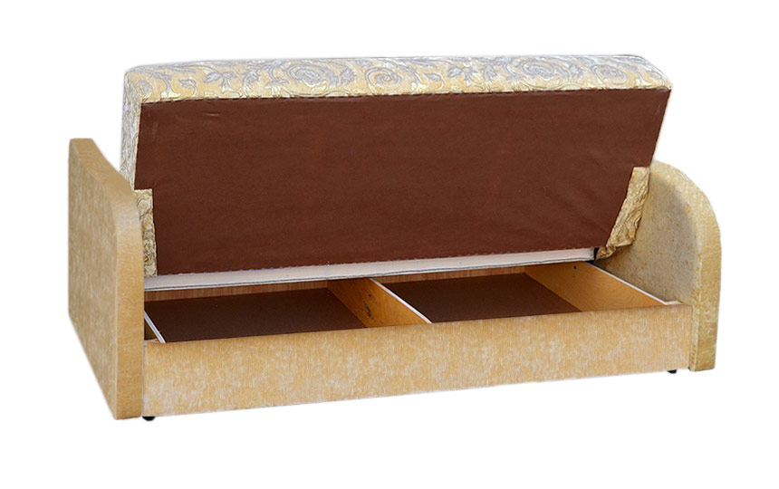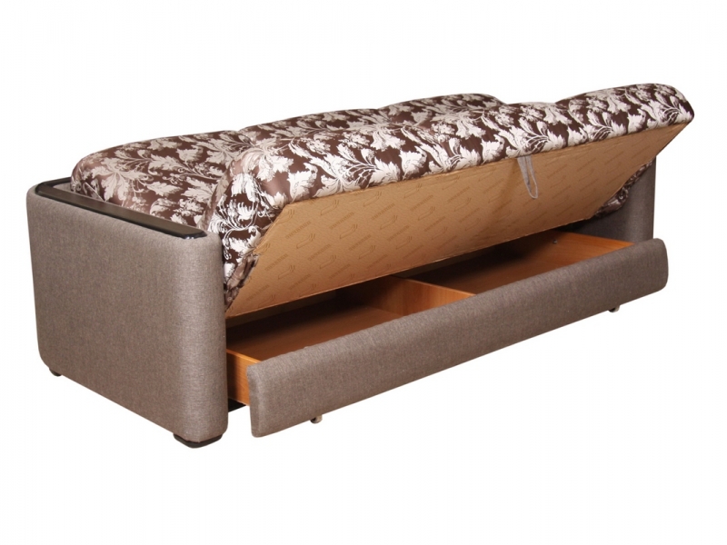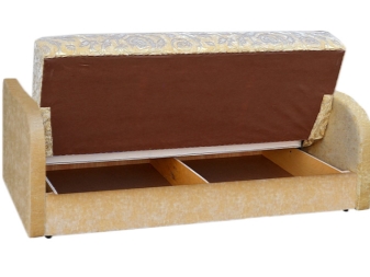 The big advantage of this type of upholstered furniture is that it does not have wheels at all. This sofa does not scratch and does not spoil the linoleum or other floor covering. Under his seat is quite a lot of space in which you can store any things - from shoes to bed linen. This is a very convenient drawer, which also saves space in the house.