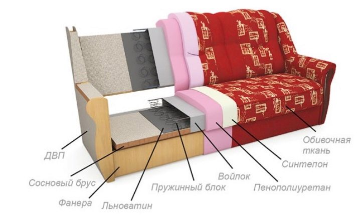 - Sofa-book should not only have a beautiful appearance. An important factor is its components, the materials from which it is made. Usually the frame of this piece of furniture is made of solid wood. Most often for the manufacture of such sofas use oak or beech, because they are very reliable. There are composite wood frames that are less durable.Typically, a wooden array is used if a particular model of a sofa-book has a roll-out design. These are better options that will last as long as possible. This sofa will perform its functions well - no matter how you load it.