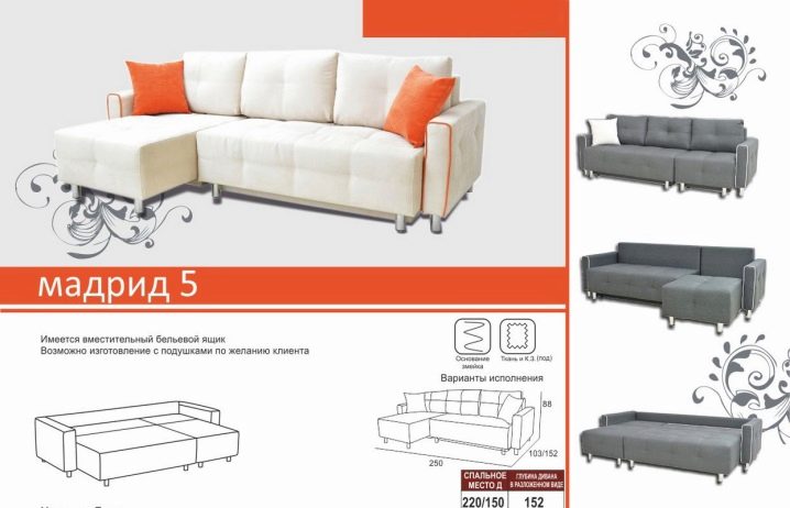 - Madrid 4. This is generally, we can say, a separate category of sofas, and all due to the fact that the angular part of them is dynamic, that is, there are special mechanisms on the left and right sides that allow to push one or another angle, although it was originally made as a straight line.