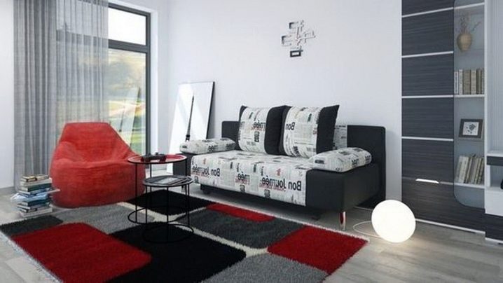 In the second image there is a “Black” model, upholstered with fabric of two colors. One part of the furniture is black, the second is white with inscriptions in a foreign language. The whole room is made in the same style, creating the look of the French room, as evidenced by the picture of the Eiffel Tower in the corner, as well as a colorful carpet on the floor. In general, all the details of the presented interior are perfectly combined with each other.The carpet acts as a link, because its color scheme allows combining different pieces of furniture, such as a red armchair with a black wardrobe and a red and black coffee table. Of course, a very white wall looks a little ridiculous, but skillful decoration with a stylish wall clock perfectly brightens this flaw, turning it into a virtue.