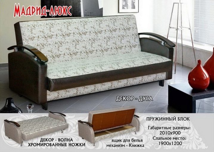 The range of sofas "Madrid" is quite large and has about twenty names: from the classic direct to luxury products with different designs. In operation and assembly, they are so simple that the instructions of the manufacturer often do not come in handy. Also, these sofas are different from others and relatively low cost, although the quality is not inferior to their opponents. This is largely due to the fact that higher-quality materials are used to create them.