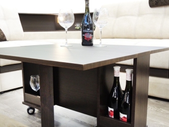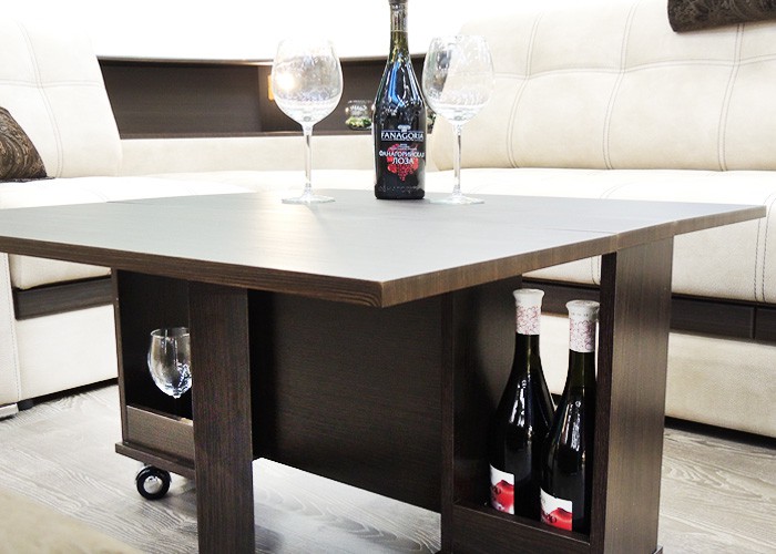 An elegant and functional table includes two compact bars. In them you can place four bottles with any drinks or wine glasses for a home celebration. And in a small box you can store important stuff.