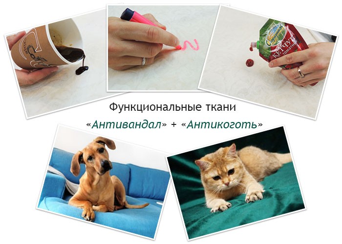 FabricsAnti-vandal»Resistant to any contamination. Stains from red wine, tea, coffee, oil and many other contaminants are easily eliminated with a wet soapy sponge. A fabric with the option "Antikogot"Differ in the increased durability. This material is not afraid of the claws of domestic animals.