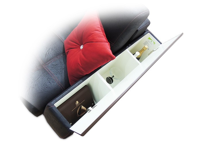 Exquisitely illuminated glass shelves in the armrest turn the sofa into a stylish interior element. Twelve levels, several shades of light design and remote control - everything is thought out to the smallest detail.