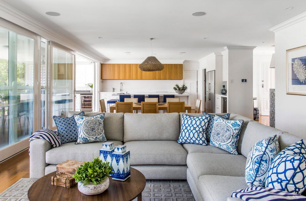 This is not just a conditional choice of additions of two different shades. In fact, it is not only the color of the upholstery and cushion that is different: accessories differ according to the row principle. For example, if the color of the sofa is light, the first pillow should be darker, and the one that is in front of it should be light.