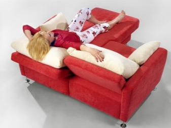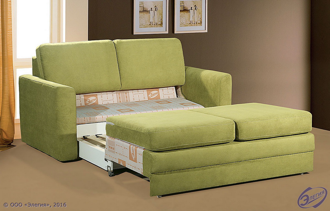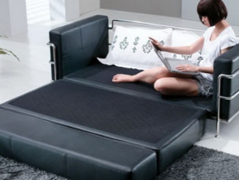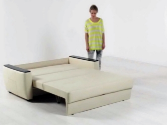 Model "Eurobook"Forward, may be interested in a simple design and an attractive price. It can be installed in narrow and small spaces. Easily disassembled to get a bed: you need to pull the seat towards you, and move the backrest to an empty seat. Under the seat is a space in which you can fold the bed and linen. This model can be installed in the middle of the room, you can put it and against the wall, decorating with pillows. In the unfolded form, it takes a lot of space.
