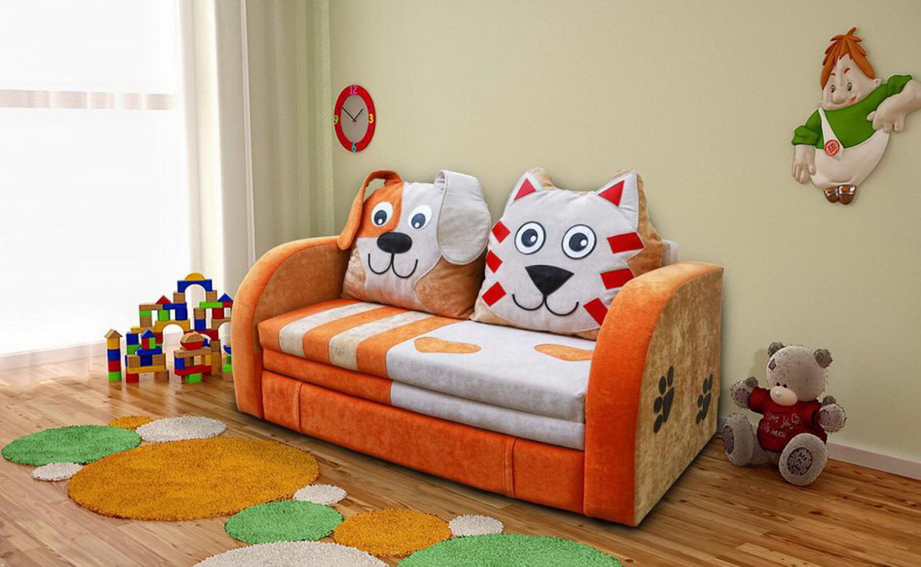Double bed can be put in the room for children. Although it is double, it takes up little space. Unusually and originally in the room for children look round double sofas. For several children, a double bunk sofa will do. Currently, a lot of models of upholstered furniture are being created, which can act as a single, double bed or loft.