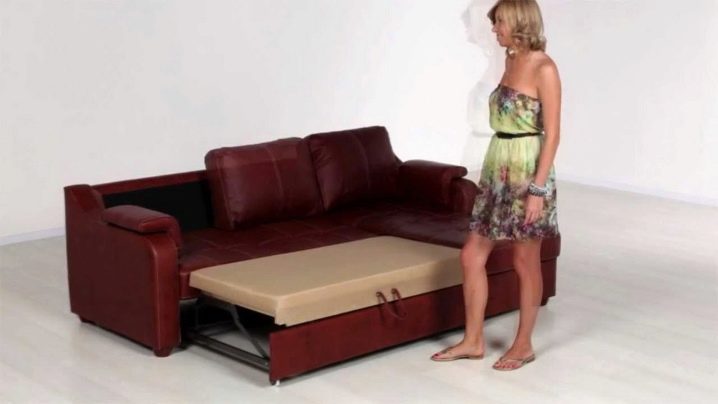 The folding sofa with the vykatny mechanism is easy to use, it is very reliable and can be used daily. With careful handling, it can last a very long time. It can be converted into a bed by pulling the seat by the loop. The transformation mechanism itself will bring everything to the correct position. The back remains in a former state. This mechanism is most often used in large and angular models. The disadvantage is the low location of the place to sleep and the fact that the wheels often scratch the floor.