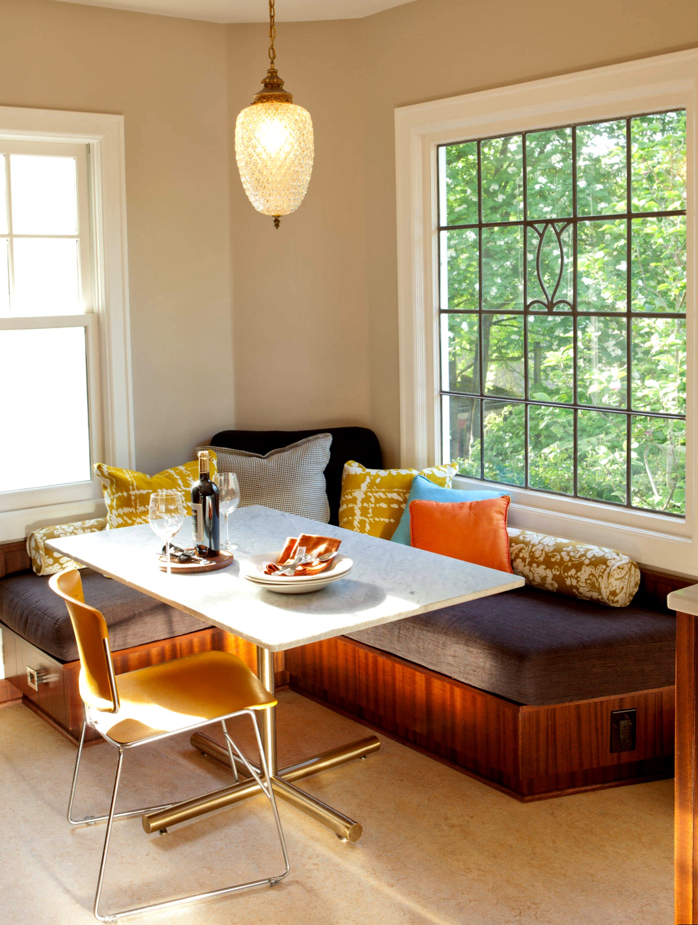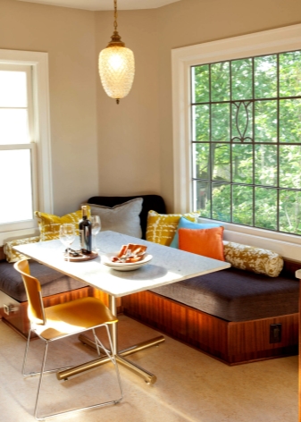 Buying a French cot for the kitchen, it is better to stop the choice on the corner and place it, respectively, in the corner. This will save space, and if necessary, it can always be expanded, moving the dining table.