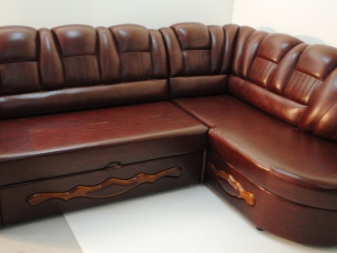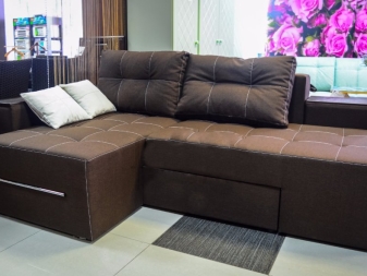 To compensate for the lack of height, which is formed when folding this back, on the surface of the seat provided a small mattress, which impose on the lowered back. In such models of corner sofas there are two drawers for linen: under the seat and under the ottoman.
