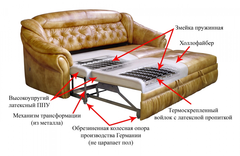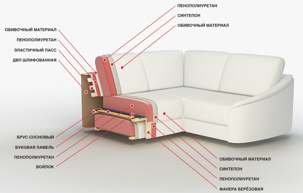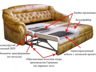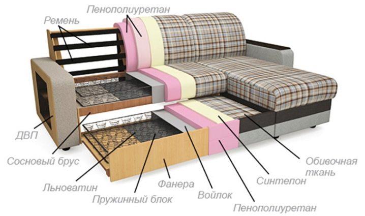 Any sofa necessarily consists of a frame, filler (spring and soft) and upholstery. In the case of complex structures, a bar, table and shelves may be included.