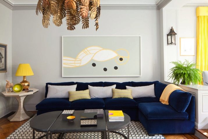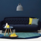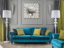 Upholstered furniture of blue tones is most harmoniously combined with the same cold colors: gray, light blue shades. If you wish, you can make adjustments in yellow, giving the “cold” room a somewhat tropical look. The combination of a blue shade with burgundy, and precisely with its light shades, is recognized as more impudent.