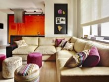 East style may allow the sofa to be replaced with soft floor cushions. It is worth remembering that they should be bright colors.Such furniture will look spectacular, if you give the room a slight touch of carelessness.