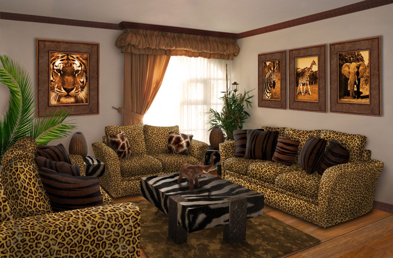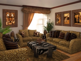 - Safari Style attractive with a mixture of African and European cultures. Every detail, no matter what culture it belongs to, should be combined with the general interior. Therefore, when choosing furniture in a room decorated in a similar style, one should decide what would be more appropriate: a more European (strict and massive) sofa or a variant with a motley ornament. The color scheme should not be bright: the best suited sand and earthy colors. Welcome variations of gray and black tones.