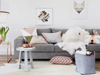 - Scandinavian style The central place in the interior is a sofa. Since the harsh climate of Scandinavia has formed special preferences for the interior, the main requirement for this piece of furniture is comfort. Because the sofas used in the design in the Scandinavian style, as a rule, very large. Sometimes two sofas are put into the room at once and several poufs are added to them.The colors of the sofas must be as neutral as possible, monotonous, with the possibility of geometric patterns.