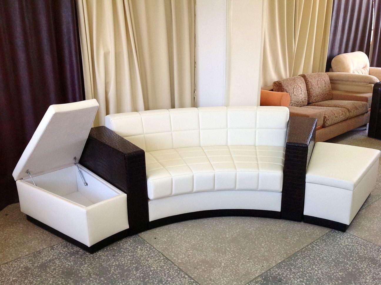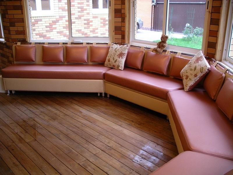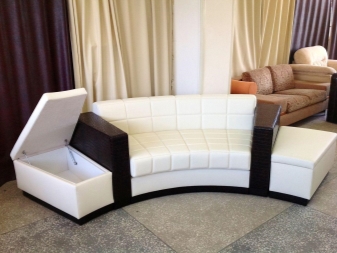 For non-standard oval-shaped living rooms, you can choose original radius bay windows as upholstered furniture.These sofas are located, as a rule, on a window ledge (window sill), have a lot of pillows and resemble a bastion in their appearance. This design will give comfort to any room with a semicircular window on which it will be pleasant to spend time reading a book or a cup of tea.
