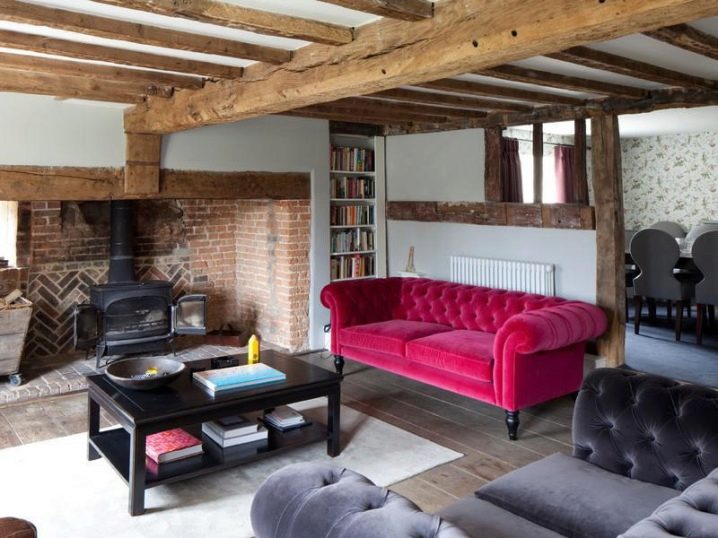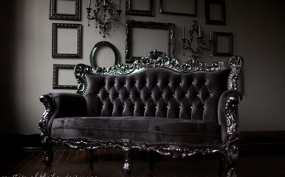 - Gothick style it is distinguished by the color of the upholstery (purple, black, red), the sharpness of the lines, and the presence of forged legs. The material of the upholstery of this Gothic sofa is velvet.