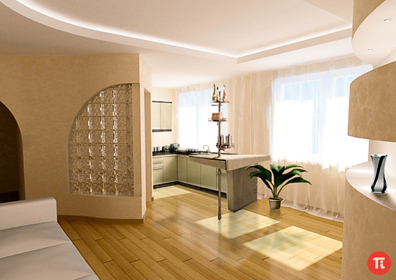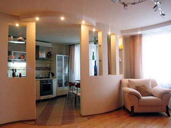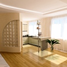 For the kitchen - a maximum of blinds or thin curtains. Lighting will complement the work on the expansion of space. It is better to refuse the central chandelier. More suitable spot lightinglocated along the walls. You can highlight glass furniture or walls with accents on paintings and mirrors. Living rooms can be left separate, if properly work with the space.