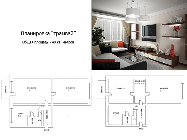 - tram option unsuccessful for living, if the family has more than two people. When one room enters another, someone has to live on the aisle. In such cases, lengthen the corridor and make the rooms separate. And the end of the corridor will involve a spacious wardrobe;