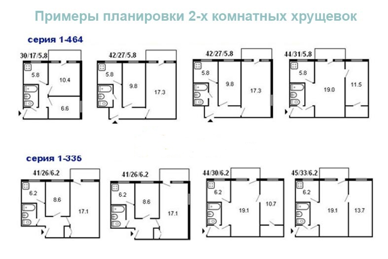 Before changing Khrushchev, you need to understand what it is. In almost all standard projects 2-room apartments have adjacent rooms. Their total area is 40- 45 sq m, living area is 26-31 sq m, ceiling height is 250 cm, external walls thickness is 30-40 cm. Due to thin walls, the heat and sound insulation is weak.In such apartments, bathrooms can be combined or separate.