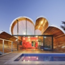This is a house, as if assembled from a designer. Wooden beams go both vertically and horizontally and diagonally; They can be painted either dark brown or varnished.