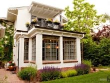 The original move is the use of doors and windows of an intricate form, it is desirable to paint them in contrast to the main part of the facade, supplemented with wooden shutters.