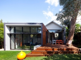 A characteristic feature is a flat or slightly sloping roof, metal or concrete walls, windows are trying to be made as high and wide as possible.
