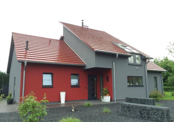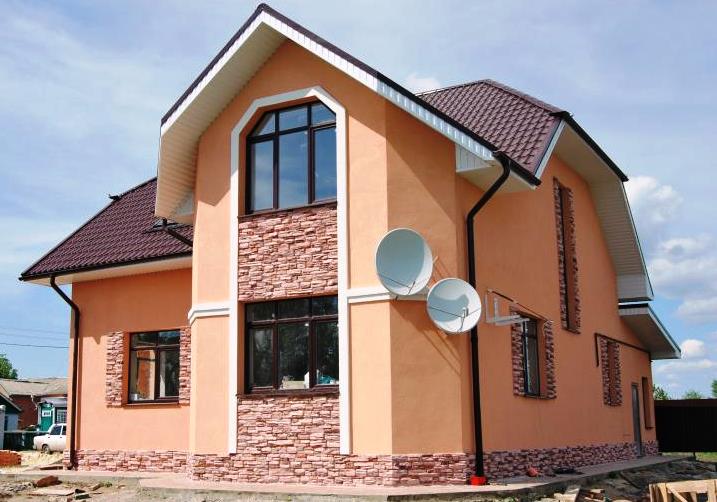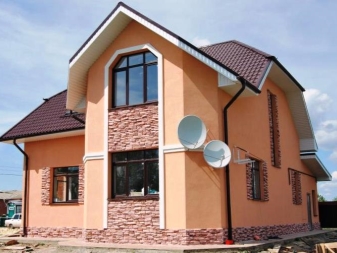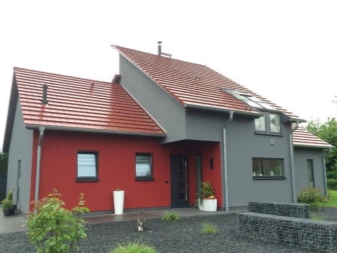 Almost any style perfectly combines decorative plaster. The original and beautiful course is a combination of a red-and-white plastered facade with a roof of dark colors and the same frames. When you want no less elegant, but more stringent design,the combination of steel-gray and red colors on the facade with soft red tones of the roof helps. If to add plaster inclusions of a tile and a mosaic, too it will turn out not bad.