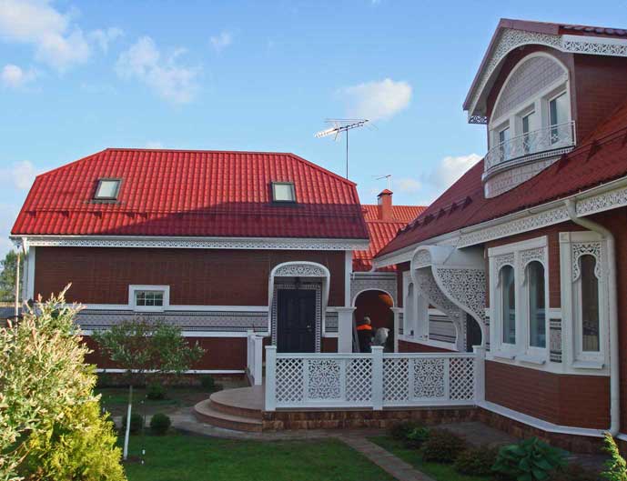 Such a facade should not seem at all archaic, old-fashioned. An important feature of this solution is its external harmony and the mandatory proportionality of the individual parts. The professional leaf cannot be used, instead of it it is expedient to apply a faltsevy roof.