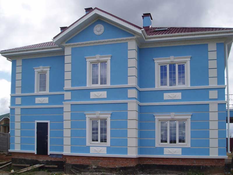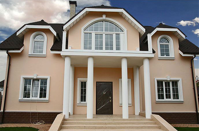 One-storey house, as well as built in two floors, can be decorated in a classic style. The undoubted advantage of this solution is good visual compatibility with the surrounding buildings, but without loss of individuality. The classics necessarily include the symmetry of the layout of the facade, including the placement of window and door openings. Decoration with eaves, columns and semi-columns, carved elements, stucco and balustrades is permissible.But to enter such a decor should be more careful than when choosing a baroque, so as not to create the feeling of kitsch.