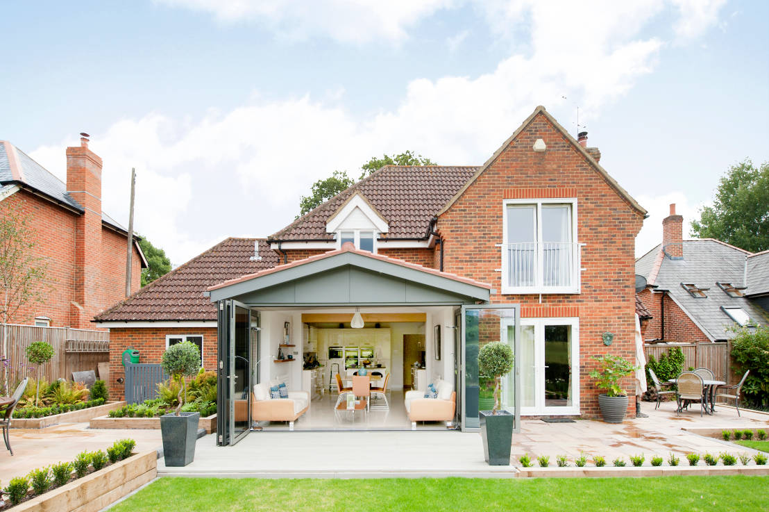 Neighborhood of a dwelling with a glazed gazebo, with a winter garden, surrounding the perimeter of the facade with a green lawn is gracefully perceived.