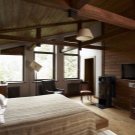 The bedroom, dressing room and study room can easily fit on the second floor. The bedroom should be furnished without excesses, opting for a king-size bed and several bedside tables. Exit to the loggia will also be superfluous. The office can be anything from a working area with a desk to a gym.