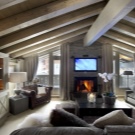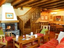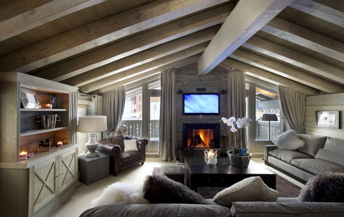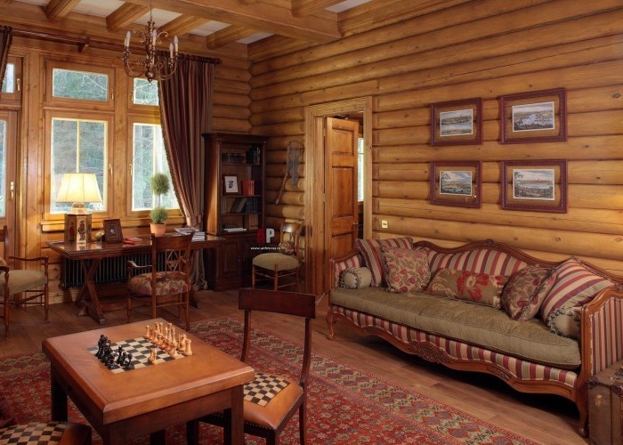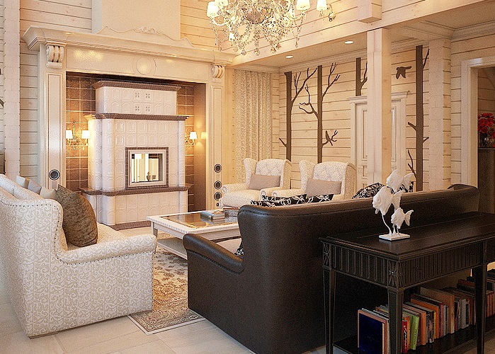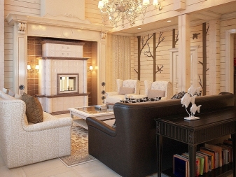 Next comes a large dining table, standing in the center of the room, above it rises an expensive luxury chandelier. Not far from the table begins a recreation area and guests: a huge sofa, a few chairs, standing around the coffee table, will become a place for joint leisure activities. The living room has a fireplace, TV and bookshelves.