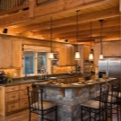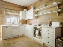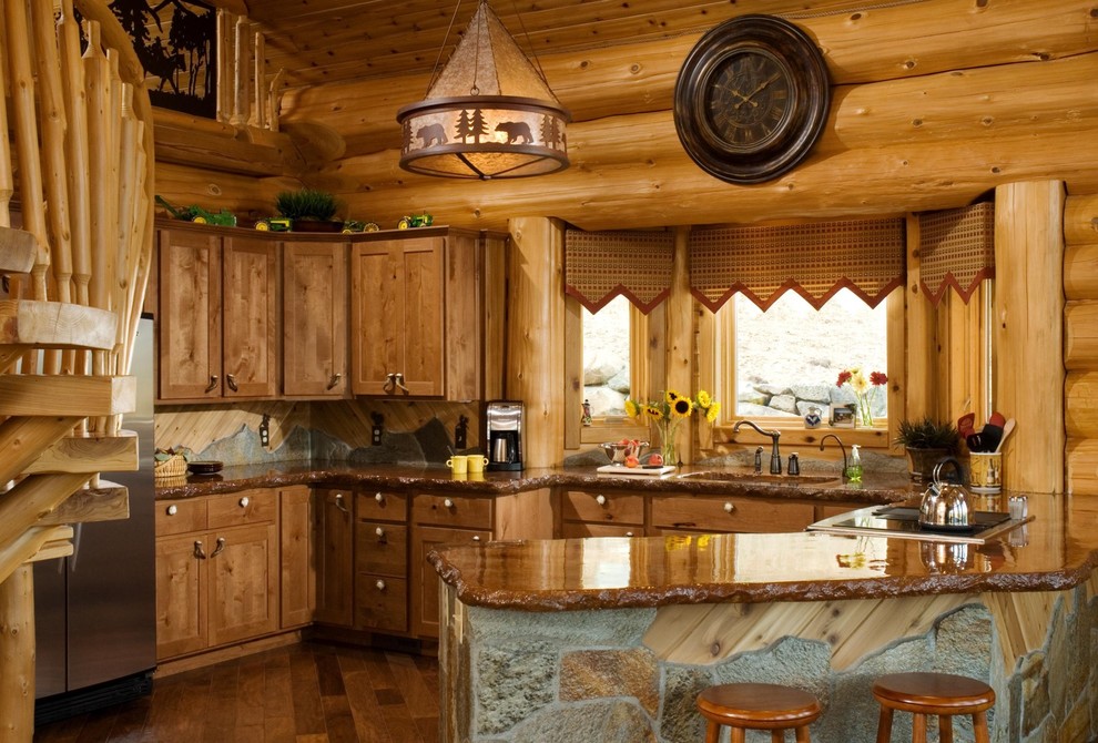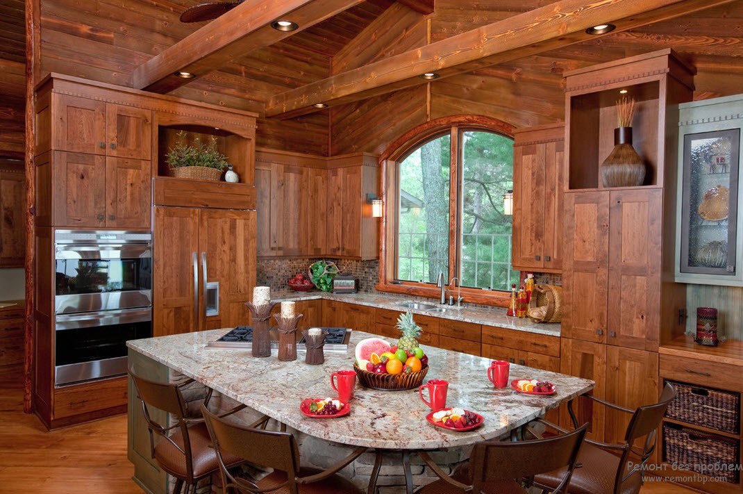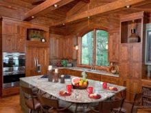 Kitchen set can be massive and exquisite., the furniture in style of a country with fancy bends and curls will perfectly fit. A large cooking zone moves naturally into the dining room with a binder component - a bar counter.