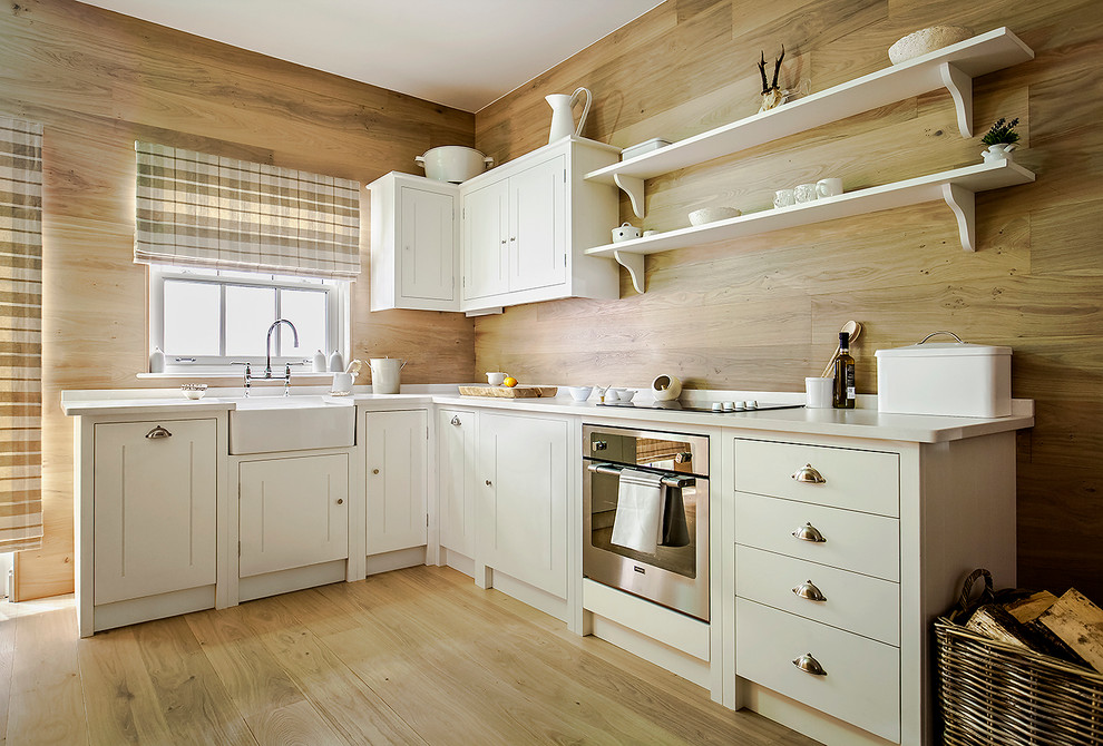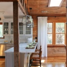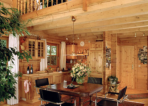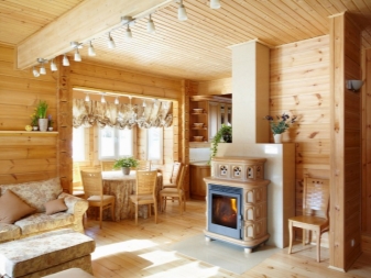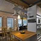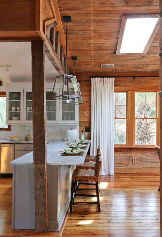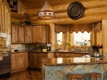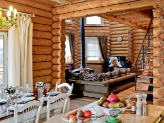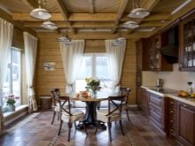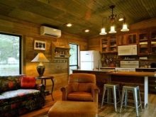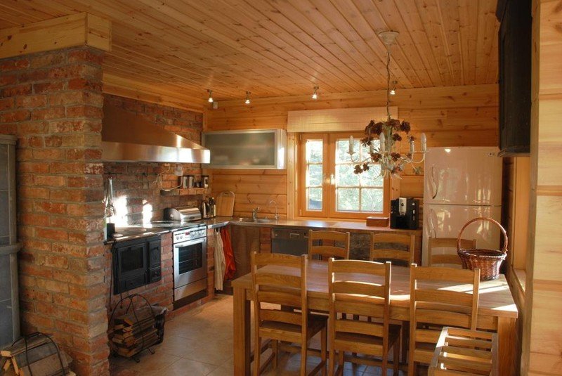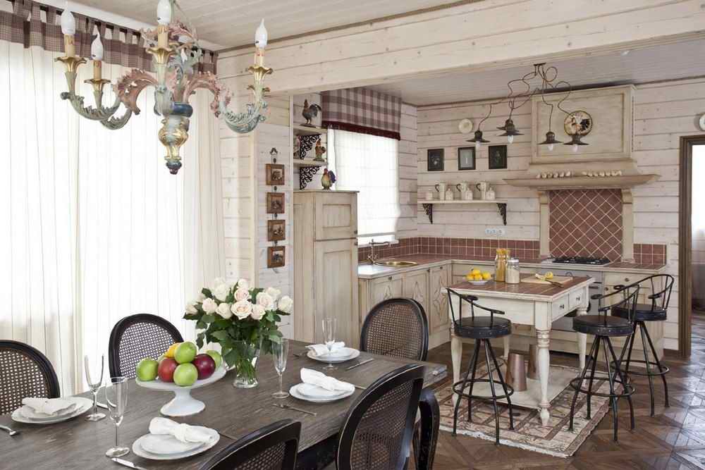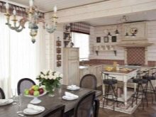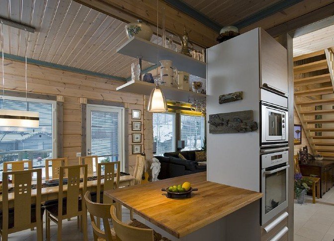 It is better to move the kitchen area to the corner of the house, choosing built-in furniture and household appliances for it. An excellent idea would be an extension to the house of a closed veranda. There you can equip a full-fledged dining room, where it will be convenient to gather the whole family. In the kitchen itself, take care of a small dining area, choose a folding table or pedestals-island to save space.