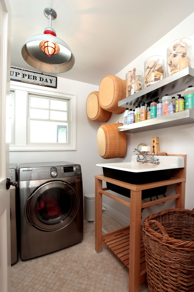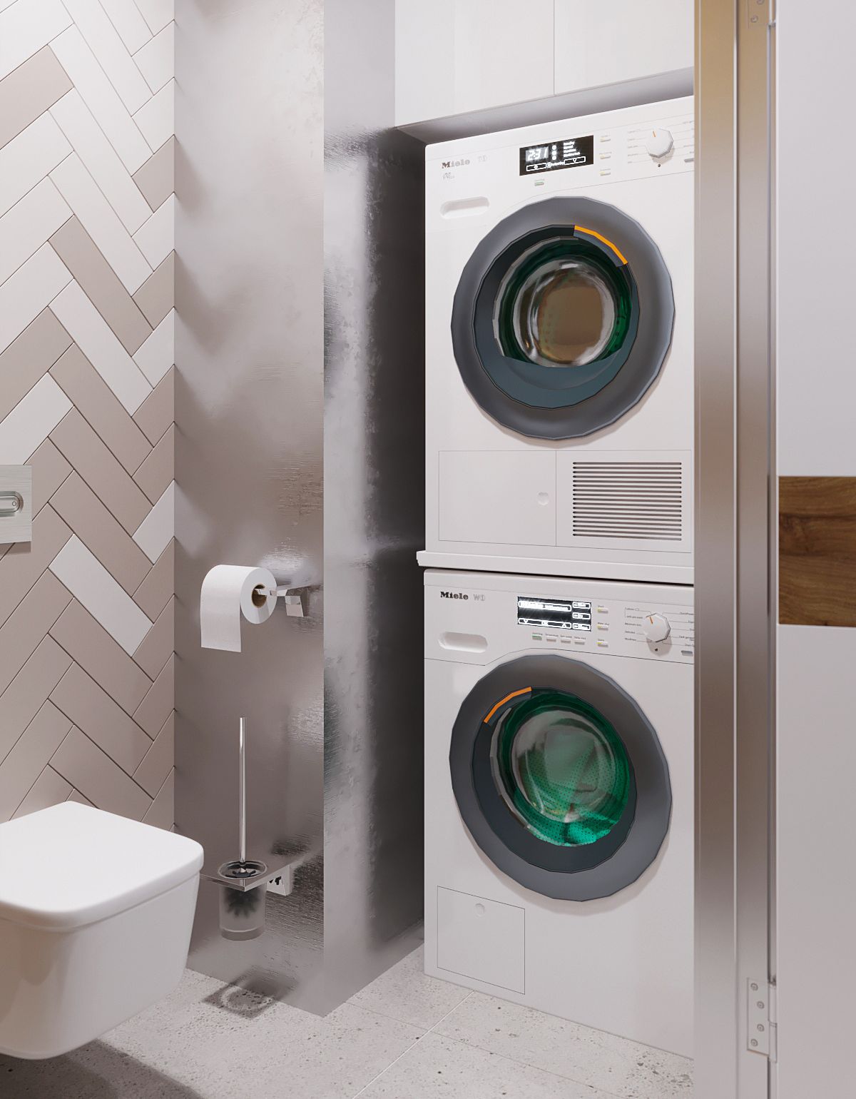 The equipment occupies a large area, and looks unattractive. To preserve the right look and atmosphere, you should think about real laundry.