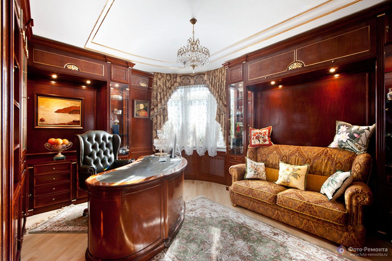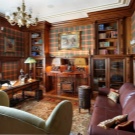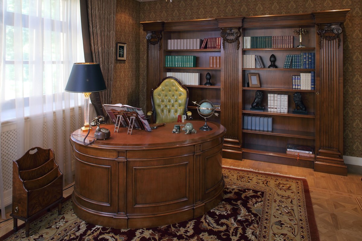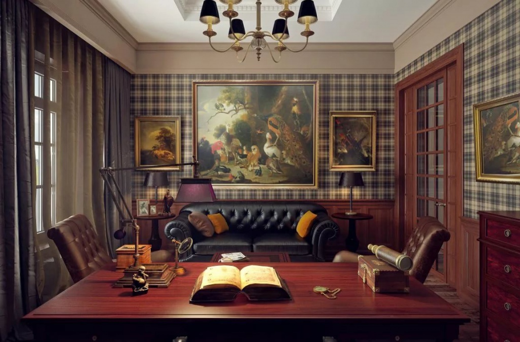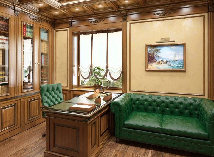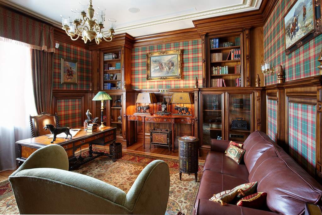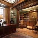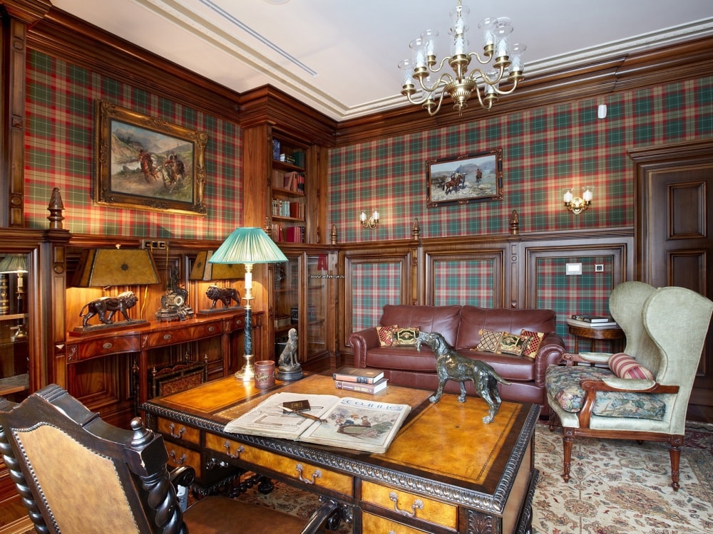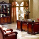 - English style. Characteristic features: furniture from a solid array of expensive breeds, upholstery from genuine leather, trimming of elements from valuable types of stone, accessories from famous designers. The classic English interior is dominated by natural shades - deep blue, emerald green, all shades of brown. This option is ideal for the head of a serious enterprise.